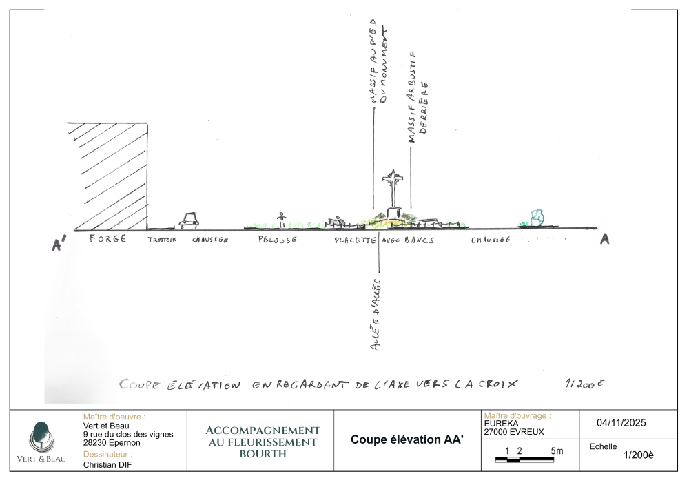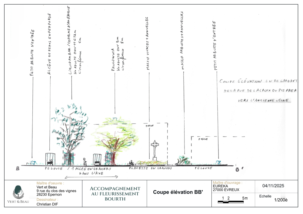 Un hommage au patrimoine et à l'histoire locale Le projet s'articule autour de la mise en valeur de la croix ouvragée, qui devient le point focal d'une composition harmonieuse. Pour ancrer le square dans son histoire, l'aménagement rend hommage à l'ancienne forge attenante :