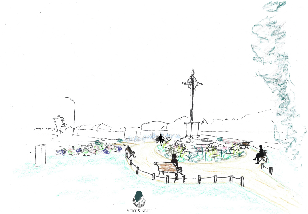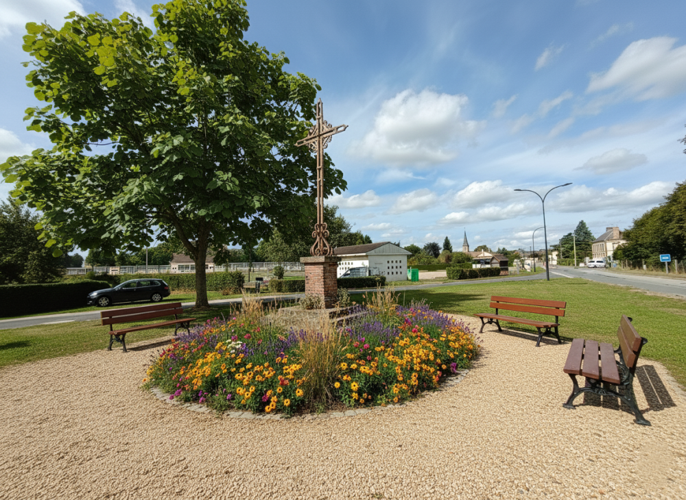 - Géométrie fleurie : Un massif circulaire généreux, mêlant plantes vivaces et annuelles, entoure le pied de la croix pour lui offrir volume et couleur au fil des saisons.