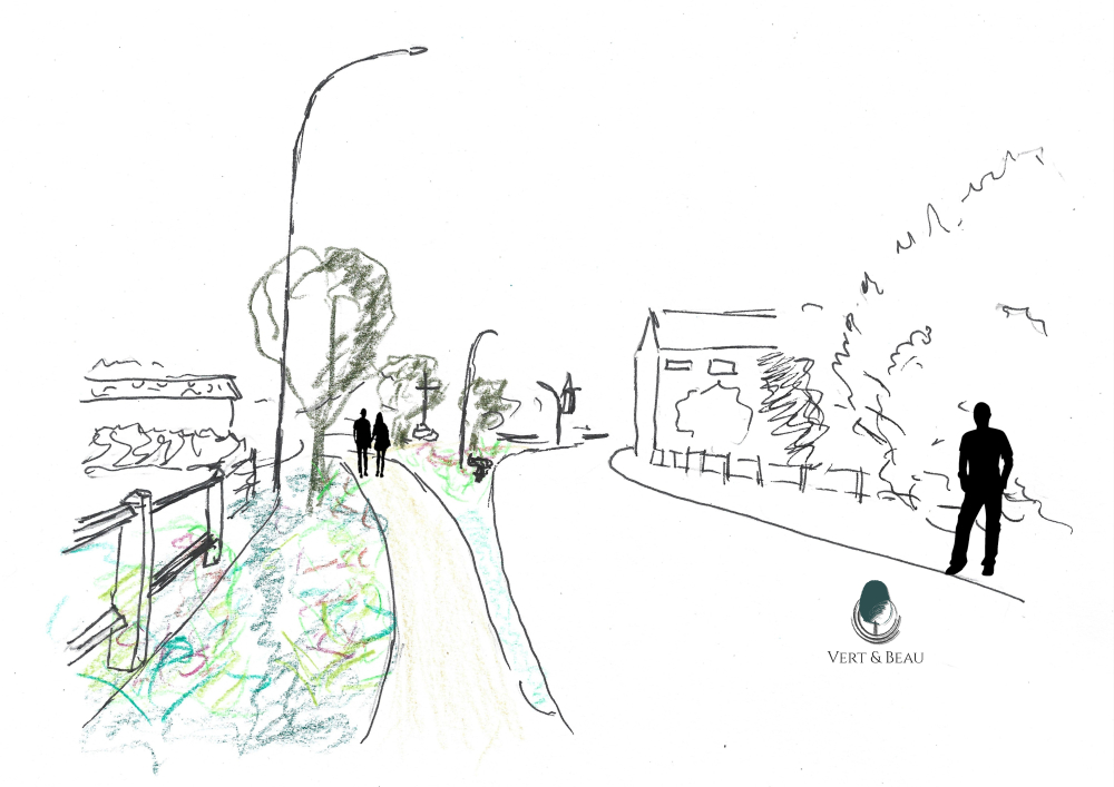 Un aménagement paysager structuré et durable L'esquisse paysagère privilégie des matériaux nobles et une palette végétale dynamique :